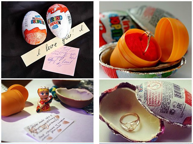 Donnez le jouet aux enfants et mettez une note d'amour à l'intérieur de la boîte, ringlet (boucles d'oreilles, pendentif ou chaîne), ou un autre objet, placez une boîte entre deux moitiés d'œuf et collez-les. Avant de faire cela, tracez un couteau bien chaud le long des bords afin que le chocolat fonde légèrement. Enveloppez doucement l'œuf dans un emballage. Grande surprise prête.