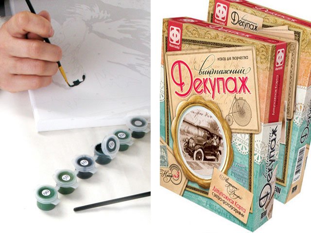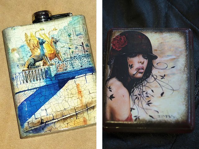 - Flacons, étuis à cigarettes et autres objets confectionnés à la manière du decoupage.