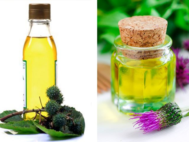 Huiles pour la chute des cheveux selon les experts: castor, bardane, lin.