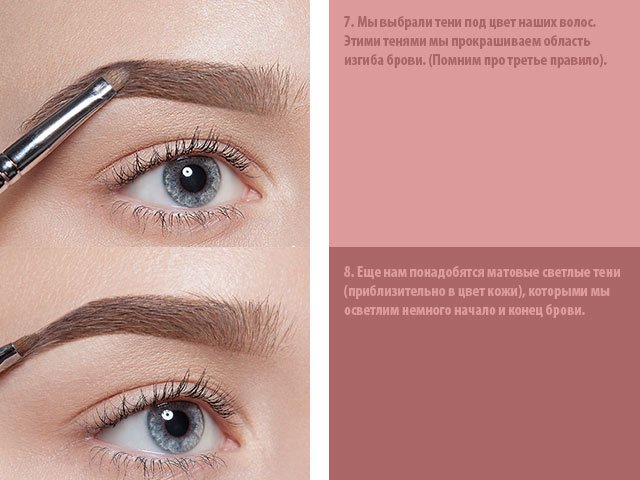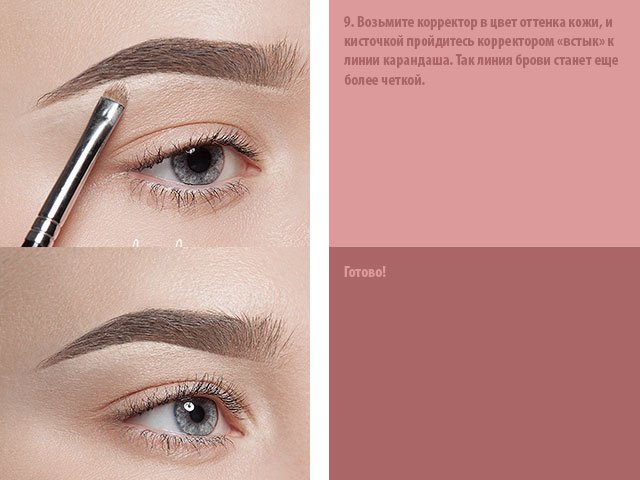 Très important! Pour rendre les sourcils plus brillants et plus contrastés, utilisez un crayon rose pâle. Peignez dessus sous le sourcil et mélangez bien (vous pouvez utiliser des nuances beiges claires et / ou un surligneur).