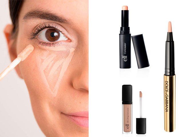 Mais le problème de maquillage le plus courant est celui des cernes et des poches sous les yeux. Ils peuvent être masqués par un correcteur dense, qui est un ton plus clair que le teint (tracez un triangle).
