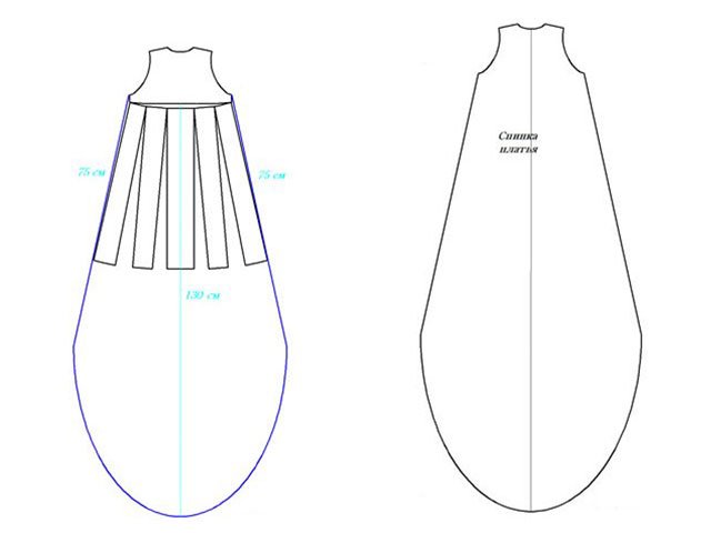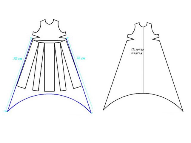 Faire une fusée éclairante trapézoïdale à partir de la ligne de l'emmanchure sur le dos de la robe, en faisant la découpe de la jupe. Marquez au milieu du dos la longueur de la jupe, par exemple, 115 centimètres et entourez l'ourlet jusqu'aux coutures latérales.