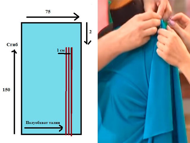 Prendre un morceau de tricot avec viscose - un carré de 150 centimètres de côté. Ensuite, vous devez le plier en deux et décoller les hanches et poitrine. Au bas du matériau, mesurez la demi-circonférence d’une mesure plus grande. Alors vous avez besoin tracer une lignemais au bord n'atteignent pas 25 centimètres.