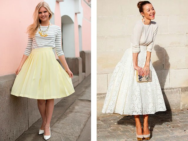 La populaire jupe de soleil qui est revenue à la mode cette année est un élément indispensable dans la garde-robe de toute fille. Elle est parfaite sur n'importe quelle silhouette et a fière allure au travail au bureau et lors d'un rendez-vous romantique. En raison des lignes douces, elle souligne parfaitement tous les avantages de sa propriétaire en lui donnant encore plus de féminité et d’élégance.