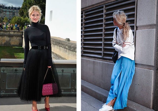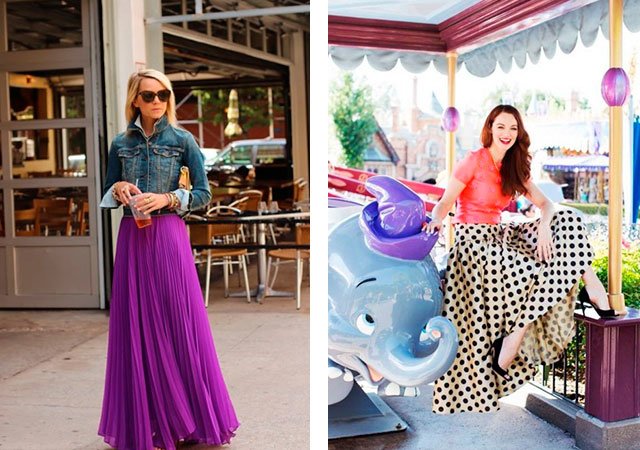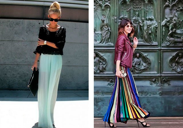 L'une des principales tendances de la saison est la jupe maxi pour plancher plissée. Aujourd'hui, les jupes plissées à plusieurs niveaux, composées de plusieurs parties horizontales de tissu de différentes couleurs, sont populaires. Mais, de tels modèles remplissent les hanches, en ajoutant quelques tailles donc, les femmes magnifiques devraient refuser un tel style.