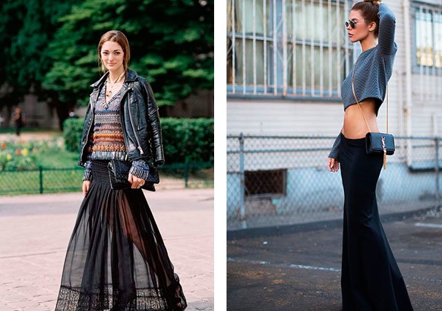 Une jupe longue longue bleue est en harmonie avec le haut des couleurs pastel douces, ainsi qu'avec le noir. La jupe bleue sur le sol est universelle, elle convient à la couleur blanche, noire, jaune, rose et grise du haut. Pour une maxi-jupe verte, blanche, verte, une chemise à carreaux fera l'affaire. Le rouge a fière allure avec un haut blanc, noir et bleu. Un t-shirt à rayures et une veste courte en cuir noire lui conviendront parfaitement.