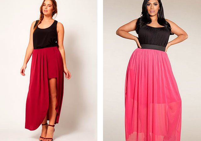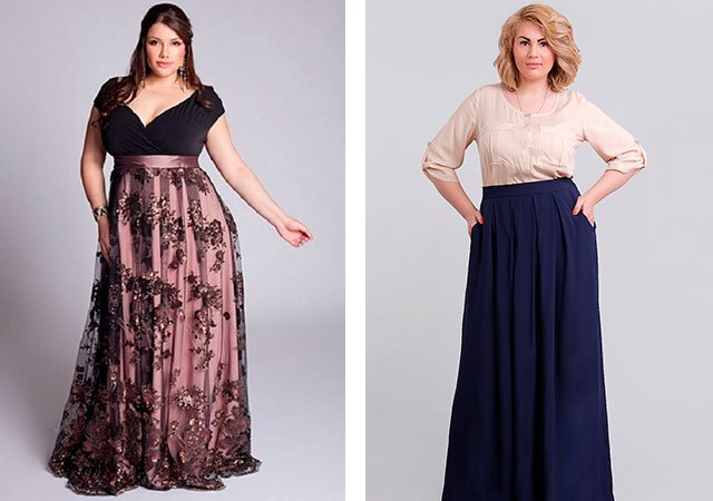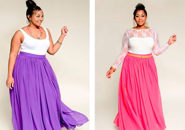 Pour les femmes à part entière, les concepteurs proposent une variété de modèles de jupes longues. Les silhouettes en forme de A ou trapézoïdales les plus pertinentes et les plus étendues légèrement à partir de la hanche, étirant visuellement la silhouette, conviennent aux femmes qui ont le ventre.