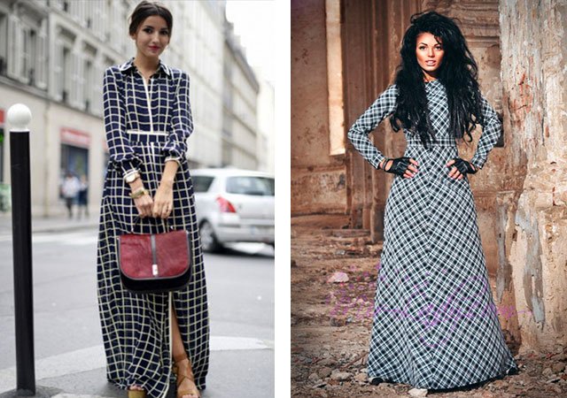 Aujourd'hui, sur le marché du commerce, vous trouverez une robe à carreaux sur le sol, courte, avec une manche, des poignets, un col et une robe fourreau, droite et évasée, avec des empiècements en cuir. 2024 robes à carreaux de différentes coupes.