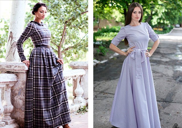 Les styles longs peuvent être grands ou petits. En 2024, les robes écossaises et anglaises sont devenues à la mode. Il existe de longs modèles d'été et automne-hiver. Cette décoration convient à toutes les occasions, même au bureau.