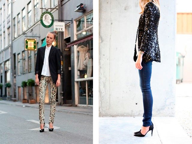 8. Un look pour les dates - des escarpins, un jean skinny foncé et une veste brillante.