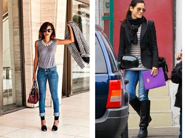 9. Un look chic pour le bureau et les promenades romantiques: une veste avec un imprimé, une chemise grise, un grand collier, un jean torsadé et des talons aiguilles.