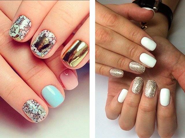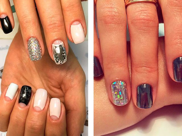 Vous pouvez créer une image inhabituelle indépendamment, dans cette option, vous pouvez obtenir différents motifs sur chaque doigt, ou utiliser autocollants prêts à l'emploi (il vous suffit de les coller) et le nouveau design brillera de nouvelles couleurs et reflétera la lumière de manière nouvelle.