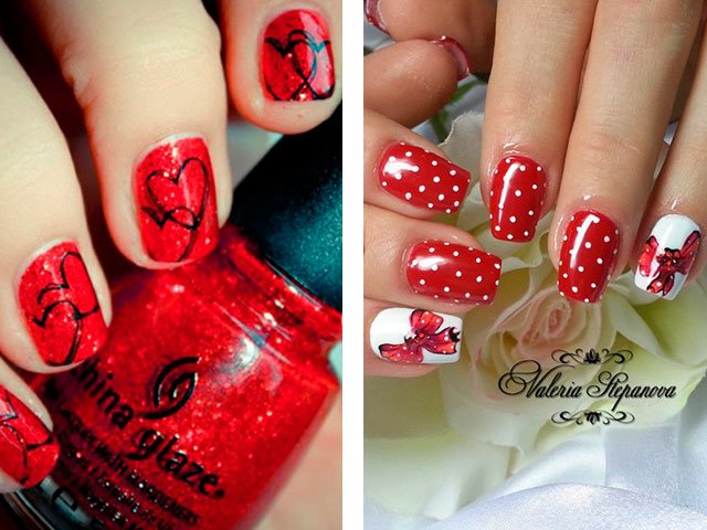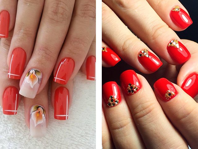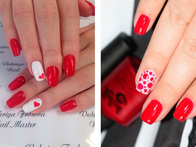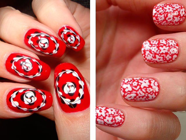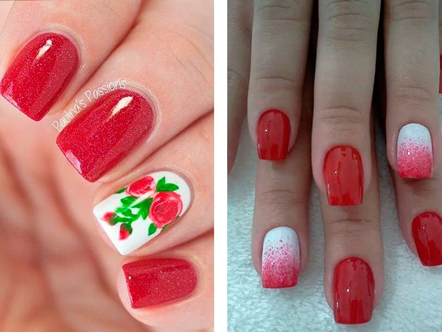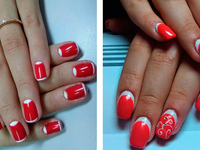 Dans leur combinaison, ces nuances sont absolument uniques. Vous pouvez créer un design délicat en ajoutant seulement quelques rayures blanches, des taches ou des fleurs. Le blanc peut également être utilisé comme couleur principale, mais c'est la base brillante qui crée l'effet le plus important. Beaucoup de maîtres se contentent de peindre tous leurs ongles en écarlate, en ne tirant que sur l'annulaire.