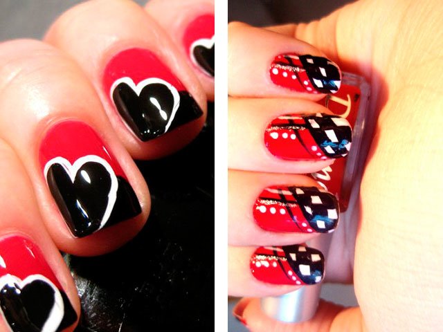 Manucure rouge avec du blanc et du noir.