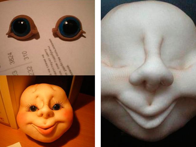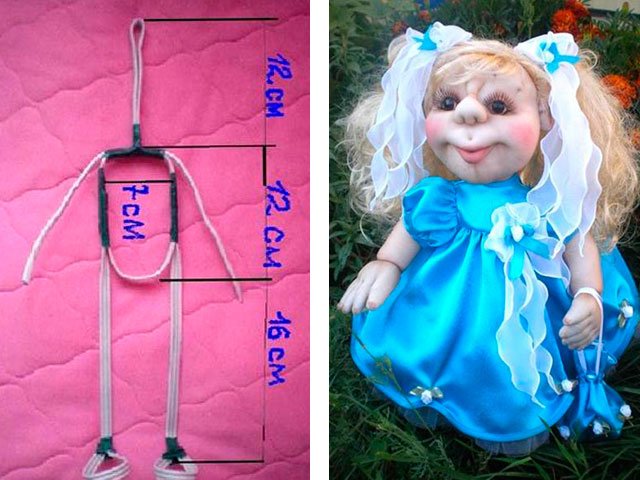Les mains sont vissées au cadre squelette, la tête également. Ensuite, le corps est formé en enveloppant le fil avec un winterizer synthétique. Le reste du corps est tiré par Kapron, les aisselles sont formées à l'aide de fils et d'aiguilles et les articulations des paumes des mains et des mains sont masquées.