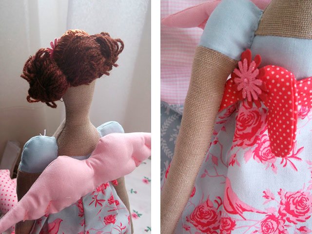 - Il est préférable de faire des poils pour cette poupée avec du fil réservé et de peindre votre visage avec de la peinture acrylique et du blush. Attachez une petite rose aux cheveux et cousez le manche en tilde à votre bouche.