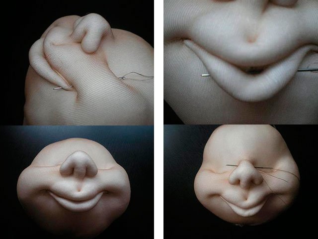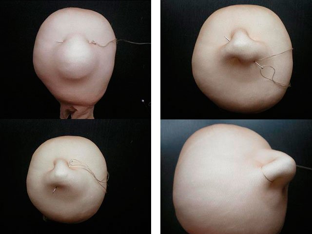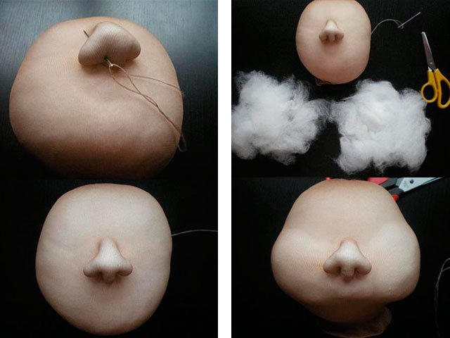 Un morceau de sintépon est placé dans un sac en nylon, une autre balle plus petite est insérée à l'avant - pour le nez. Tout d'abord, le nez est formé à l'aide d'une aiguille avec un fil. Ensuite, vous devez faire un creux pour une narine. La deuxième narine est également établie.