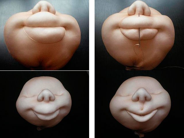 Au fur et à mesure que les lèvres sont brodées, l'aiguille est retirée dans les orbites, de sorte qu'elles commencent à ressembler à des "bateaux" et non plus à des points, comme c'était le cas au tout début. L'aiguille doit être sortie au milieu de la lèvre supérieure pour que les lèvres se plient.