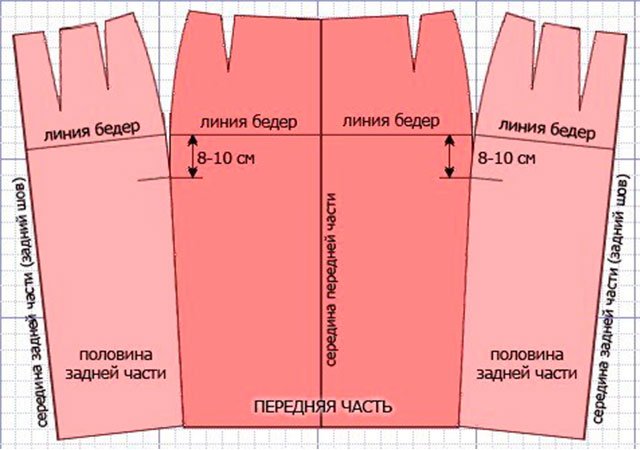 Le tissu est plié avec sa face vers l’intérieur. Les mesures sont prises (taille et hanches). Un quart de la circonférence de la cuisse est écarté de la ligne de pli. À partir du haut - la longueur souhaitée de la jupe. 20 cm sont mesurés à partir de la taille et une autre ligne est tracée. Il s'avère que la hauteur des hanches.