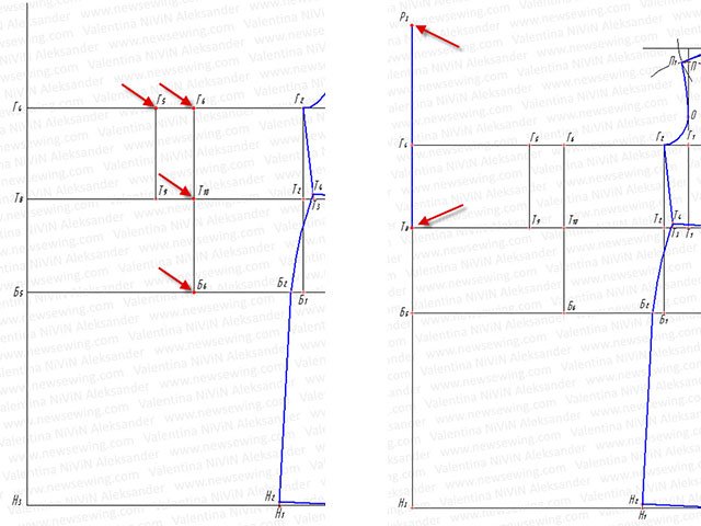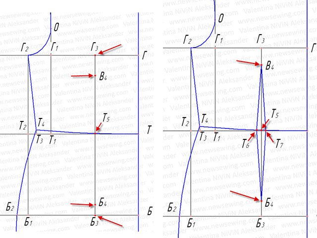 Distance GG1 diviser en deux et mettre un pointG3. De point G3 tracer une ligne verticale vers le bas et à son intersection avec la ligne de taille, nous mettons un pointT5, avec une ligne de hanches - un pointB3. De pointG3 pose le 4 cm et mettre un pointB4 mais du point B3 en haut - 3 cm et mettre un pointB4.