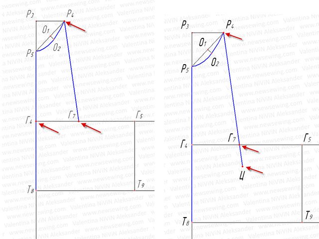 PointsP4 et P5 on connecte la ligne, on la divise en deux et le milieu indique le pointO1. De pointO1 mettre de côté à angle droit 1,25 cm et dénote le point02. Points P5, 02 et P4nous relions une courbe lisse et obtenons le décolleté de la tablette.