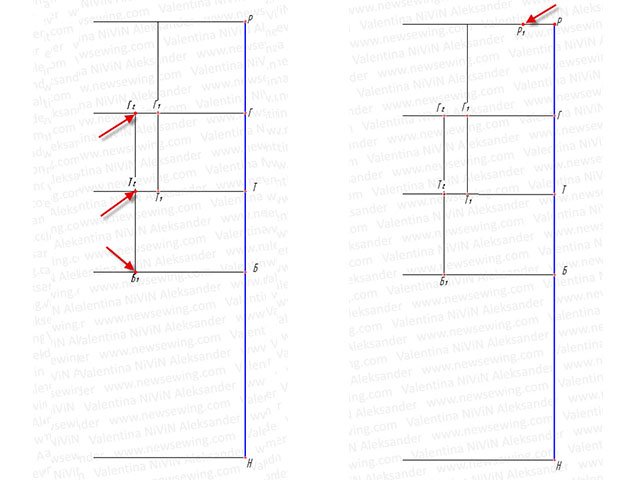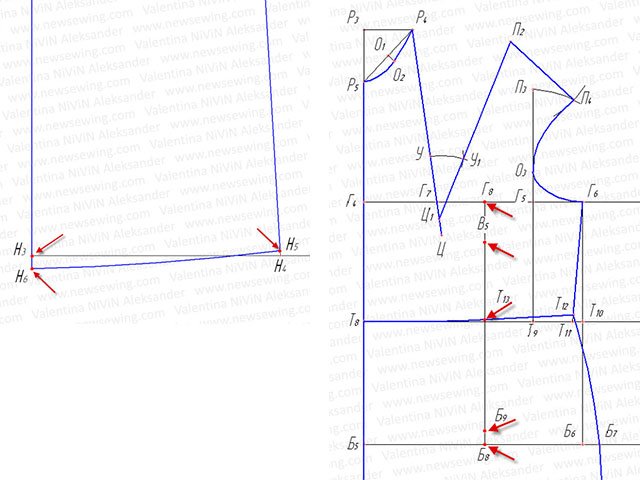 De pointN à gauche, nous reportons une valeur égale à la largeur du dos le long des hanches (voir dessin, cette distance) BB2) plus 2-3 cm et mettre un pointH1. Points H1 et B2 connectez une ligne droite. De point H1 mettre de côté 1cm et mettre un pointH2. Points H2 et Nconnectez une courbe lisse.