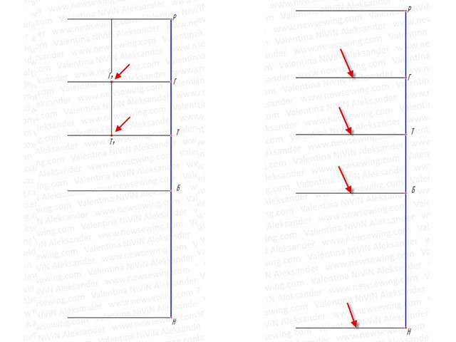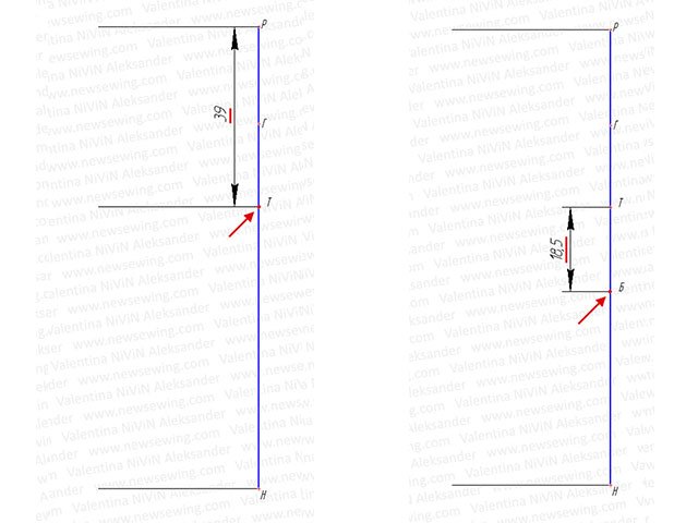 À partir du point Г à gauche, nous reportons la largeur du dosCc (19.5) plus0,5 cm (augmentation en ajustement libre) et mettre un pointG1 :