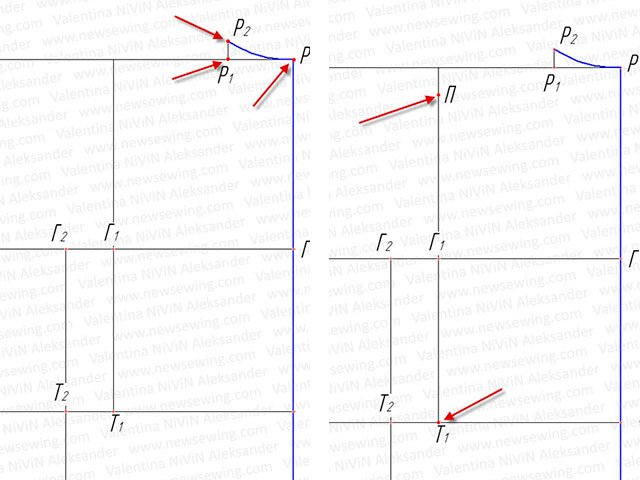 De pointG5 mettre de côté 1/4 les distances G5P3 (4,5 cm) et mettre un point03. Point 03 —point de contrôle. Lorsque vous insérez une manche dans une emmanchure, elle se connecte avec une marque sur la manche aux pointsOh