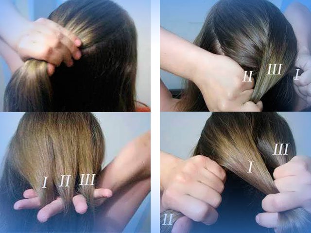 3) déterminez le point de départ de l'épillet et prenez un petit mèche de cheveux, puis un autre mèche de la moitié gauche et le troisième de la moitié droite des cheveux.