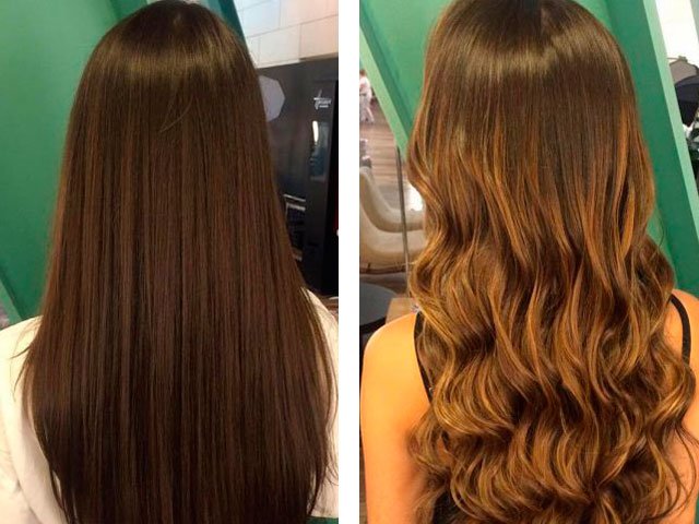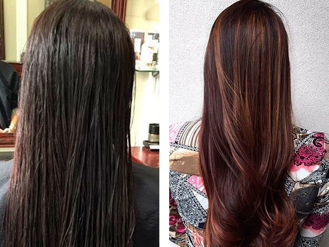 Soulignement vénitien sur les cheveux noirs avant et après les photos: