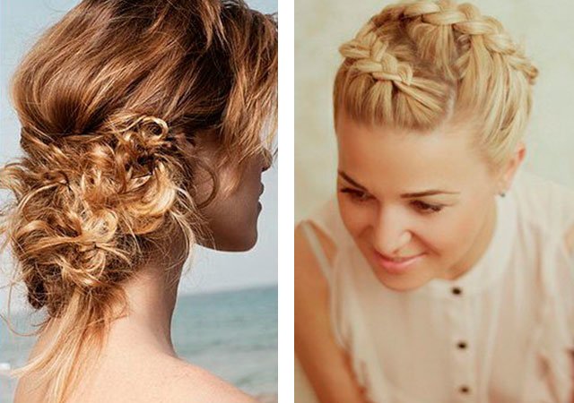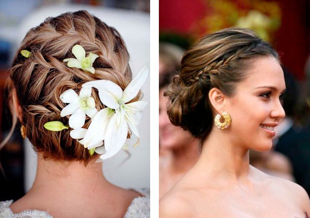 Le style français vous permet de faire une coiffure chic avec un noeud. Cette vue est un peu plus compliquée, cependant, idéale pour toute célébration. Appliquez d'abord de la cire sur les racines pour les rendre obéissantes. Maintenant, tissez une tresse d'un côté à l'arrière de la tête et là nous la fixons avec des épingles à cheveux. Nous répétons le même tissage d'autre part. Peignez légèrement les boucles pour que le nœud ne semble pas petit. À partir des brins, formez un garrot et un cercle dont les extrémités sont cachées au milieu du cercle. Fixez la coiffure entière avec des épingles à cheveux et de préférence avec un vernis.