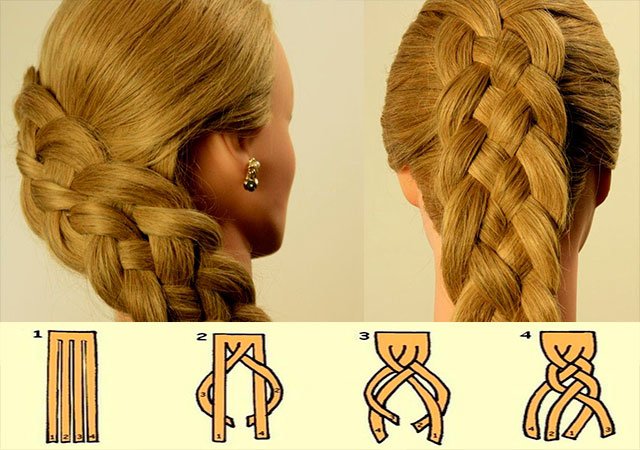 Réel est une queue de cochon de quatre brins. La coiffure est faite sur la base de 4 brins, où 1 et 2 brins sont d'abord entrelacés, ainsi que 3 et 4. Après cela, les brins centraux sont entrelacés. Répétez ces étapes jusqu'à la fin du tissage. Cette coiffure est volumineuse, elle peut être combinée avec un ruban.
