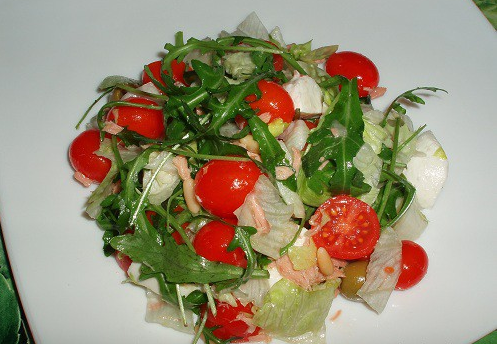 Étape 7 Après cela, salez la salade et assaisonnez avec le jus d'un citron. Ensuite, mettez la roquette dans un saladier, avec les tomates hachées et les pignons de pin par-dessus.