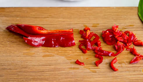Étape 4 Couper le poivron en deux, retirer la tige et les pépins. Couper en lanières.