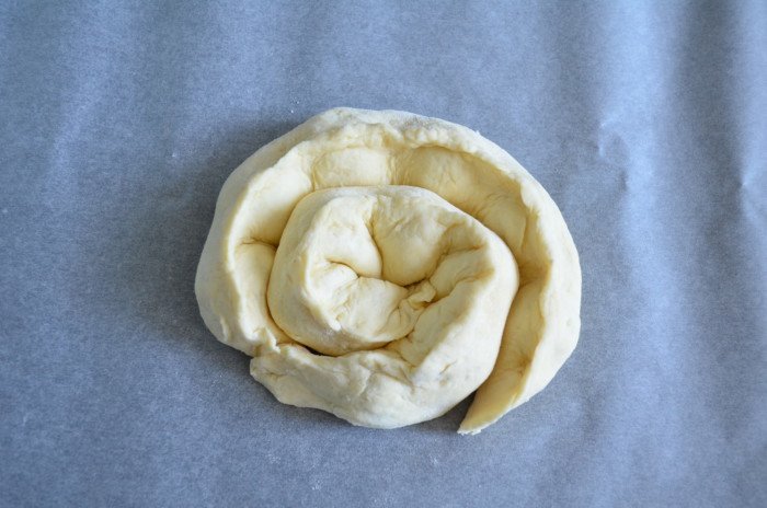 Étape 8. Connectez la pièce suivante à la fin de la cochlée et continuez à tourner autour des bobines enroulées. Continuez à vous rouler jusqu'à ce que la pâte et le remplissage soient terminés.