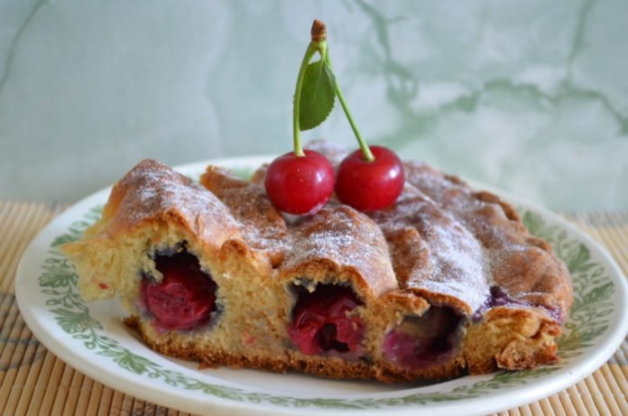 Étape 6 Versez de l'amidon avec du sucre sur chaque bande et placez les cerises à la même distance, saupoudrez de sucre. Pincez très fermement les bords de la pâte sur les cerises.