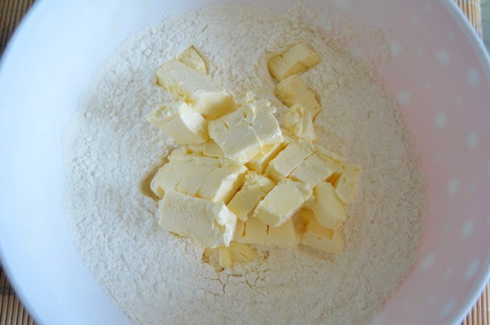 Étape 1 Tamiser la farine. Ajouter le sel, la vanilline, la levure et le beurre en tranches.