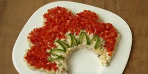 Étape 11 Sur le contour de la salade, faire un trait de mayonnaise, garnir d'olives, de maïs, de graines de grenade et de feuilles de persil. Vous pouvez également utiliser des baies, des canneberges ou du viorne pour la décoration.
