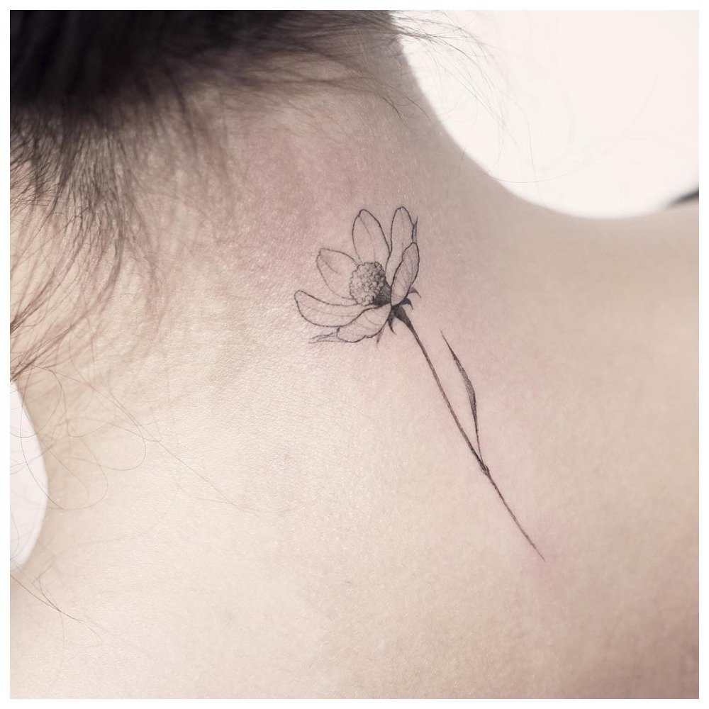 Surtout les filles préfèrent les petits tatouages sur le cou, car l’espace ne leur permet pas de se balancer et de remplir une intrigue détaillée. Si nous parlons d'un tatouage indépendant, et ne fait pas partie de l'intrigue, alors les fleurs, les papillons, les libellules sont populaires.