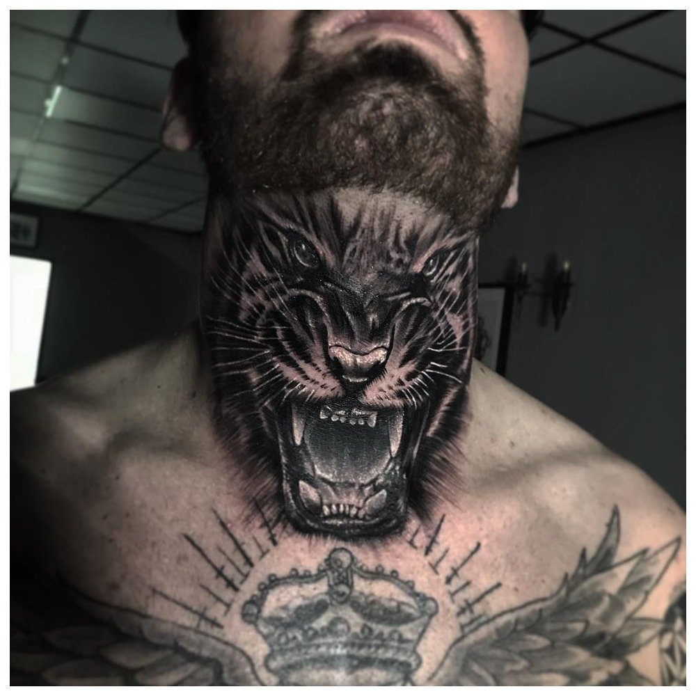 Sur le devant de la gorge, le motif ferme les soies. Les hommes se font tatouer cette partie du corps s’ils savent qu’ils vont se raser constamment. Sinon, ce tatouage ne sert à rien.