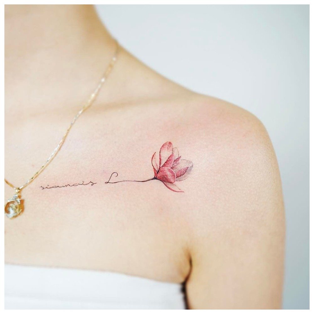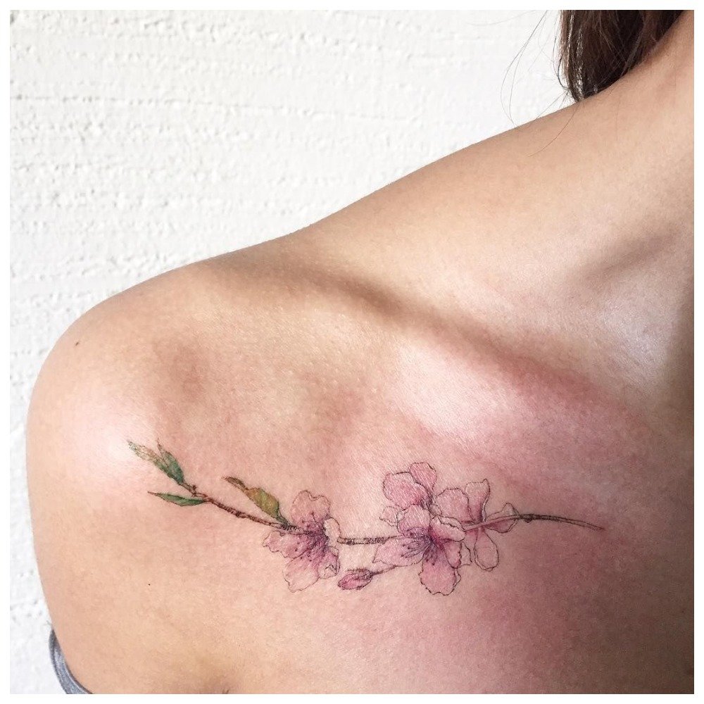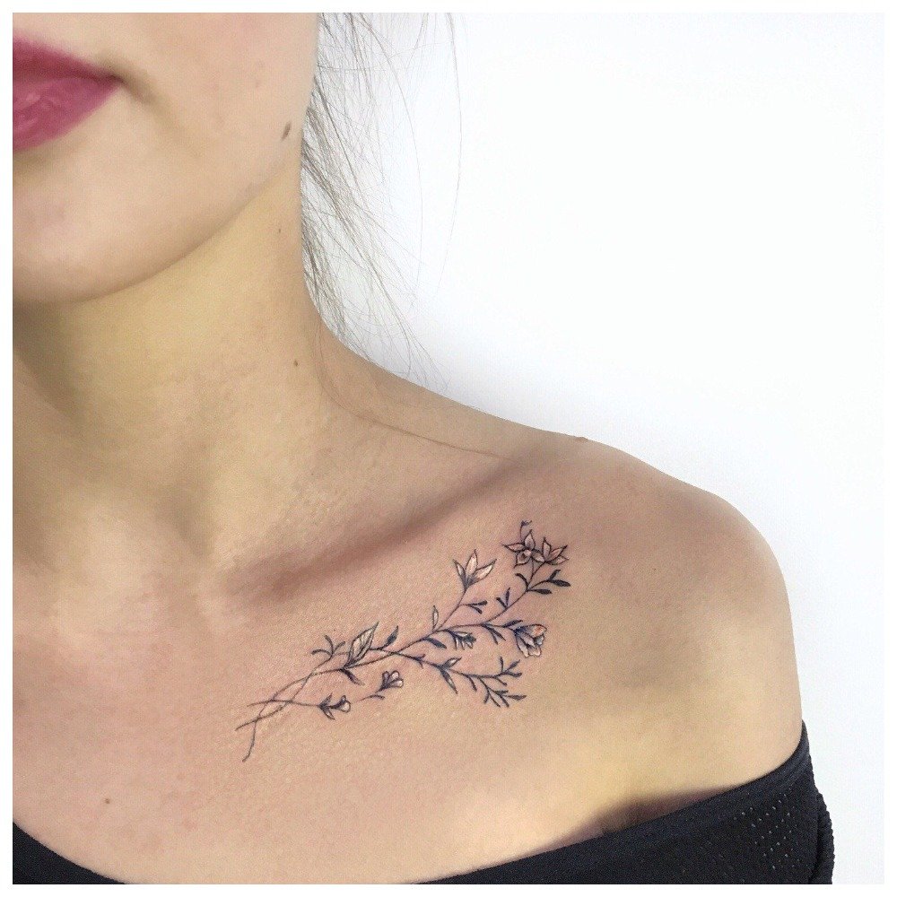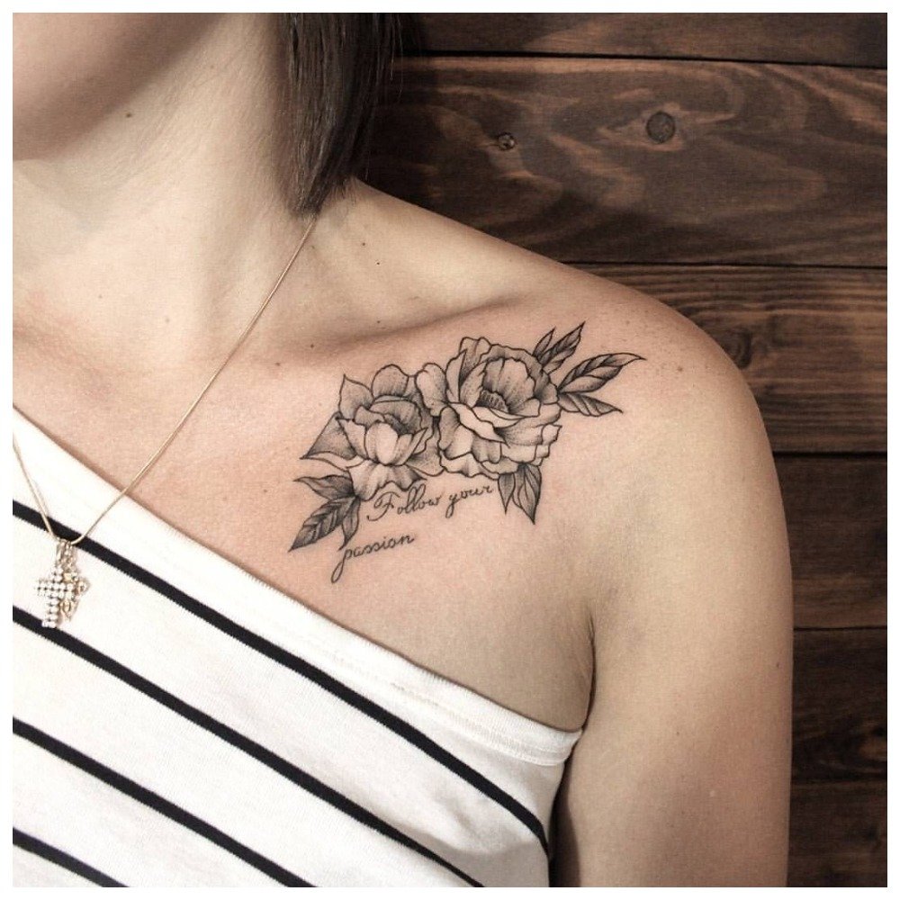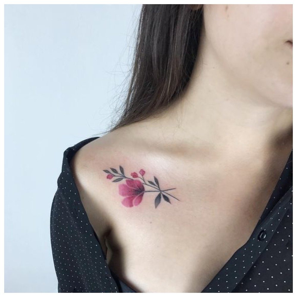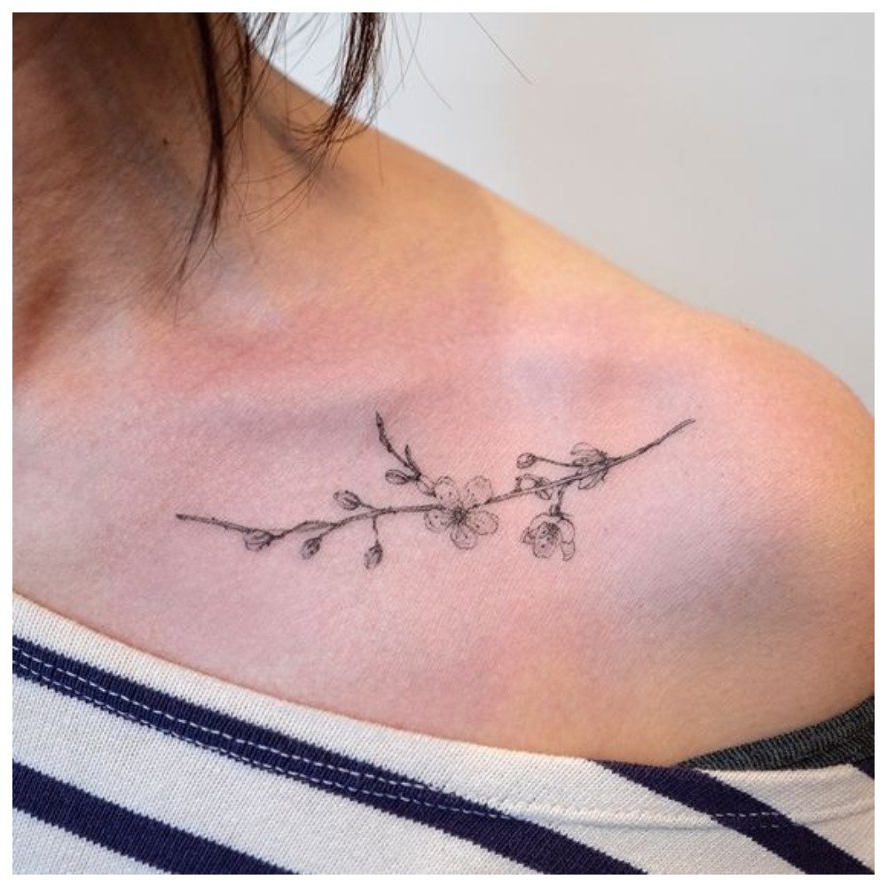 Les tatouages qui regardent le long de la clavicule dans la direction de l'épaule sont plus beaux. Il s’agit souvent d’un rameau, d’une inscription ou d’une fleur délicate. Un dessin plus grand capture généralement une partie de l'épaule, car il nécessite plus d'espace.