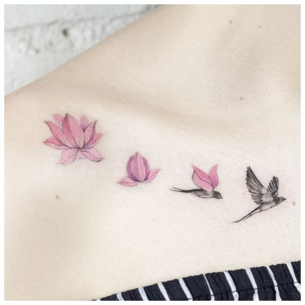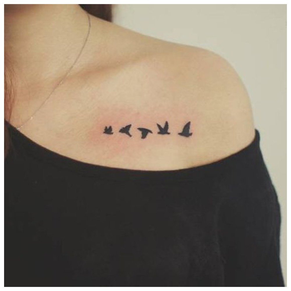 Oiseaux - Un sujet de prédilection pour les filles qui font un tatouage à la clavicule. L'oiseau en flèche symbolise l'amour de la vie, la liberté, le courage d'affronter les difficultés. Inconsciemment, un oiseau est associé chez l'homme à la spiritualité et à la gentillesse. Par exemple, les filles qui préfèrent une vie de famille paisible préfèrent les pigeons.