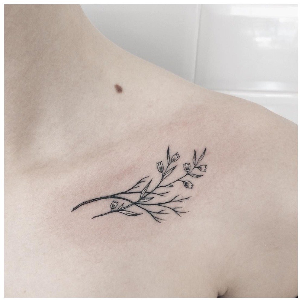 Tatouage de brindille sur la clavicule n'a pas de signification particulière. Une telle image est choisie par les filles qui veulent mettre l'accent sur leur féminité.