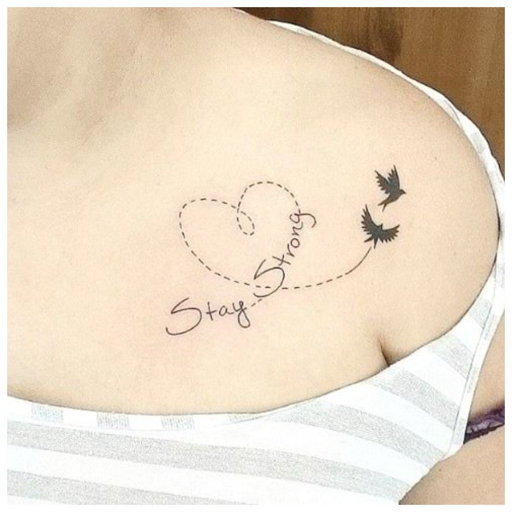 Lettrage - Un tatouage très populaire pour la clavicule. Les filles les choisissent si elles ont quelque chose à dire aux autres. Si la phrase est choisie dans une langue étrangère, la fille veut absolument attirer l'attention. Tatouage de lettrage pour les filles ayant un sens et un sens sur la clavicule faire dans l'une de ces langues - anglais, français, latin et votre langue maternelle.