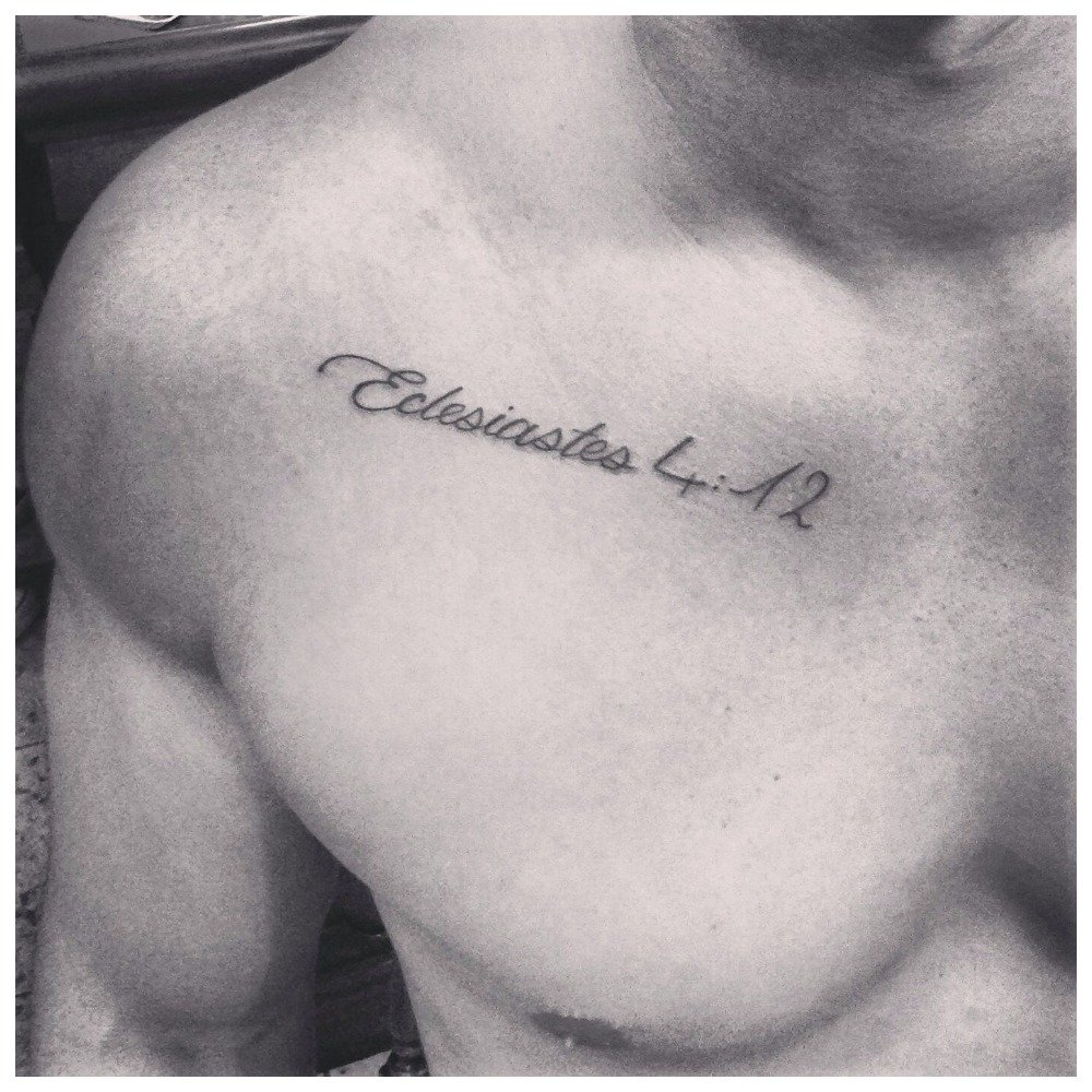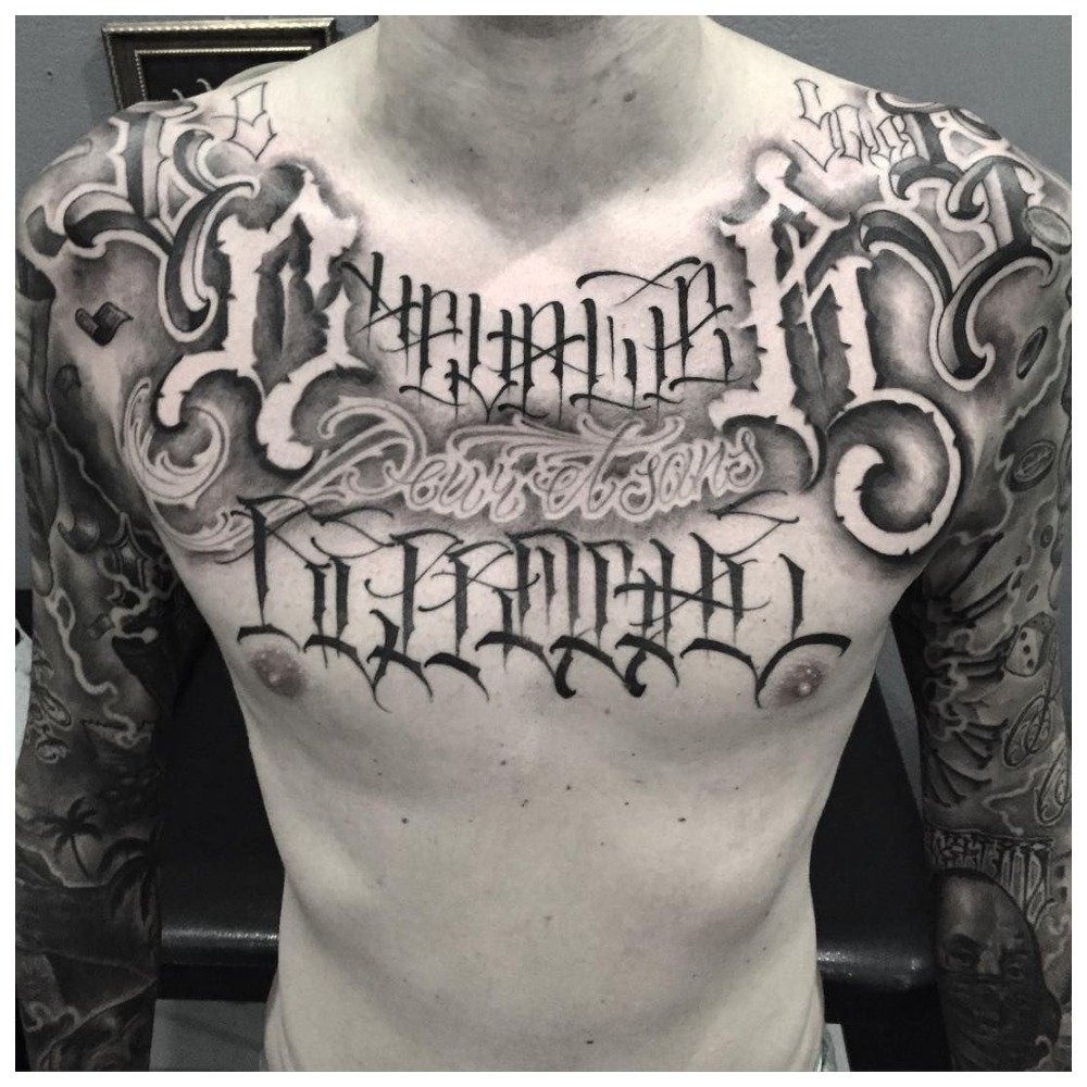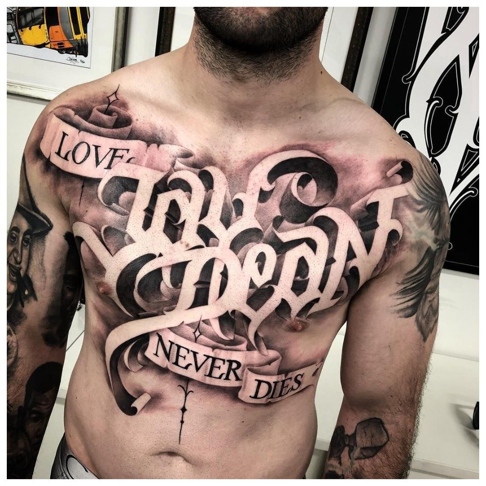 Dans un premier temps, un petit tatouage sera inscrit sur la poitrine d'un homme. Cela peut être une citation importante, un slogan, le nom de votre bien-aimé. De plus, il n'est pas nécessaire que la citation soit dans une langue que tout le monde comprend. Cela peut être latin. Dans ce cas, l’accent est mis sur la beauté du dessin du tatouage et non sur la signification.