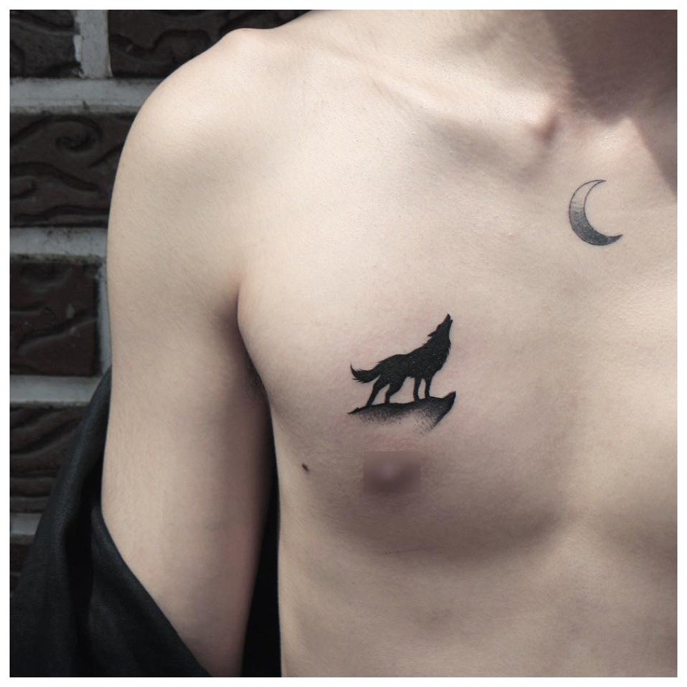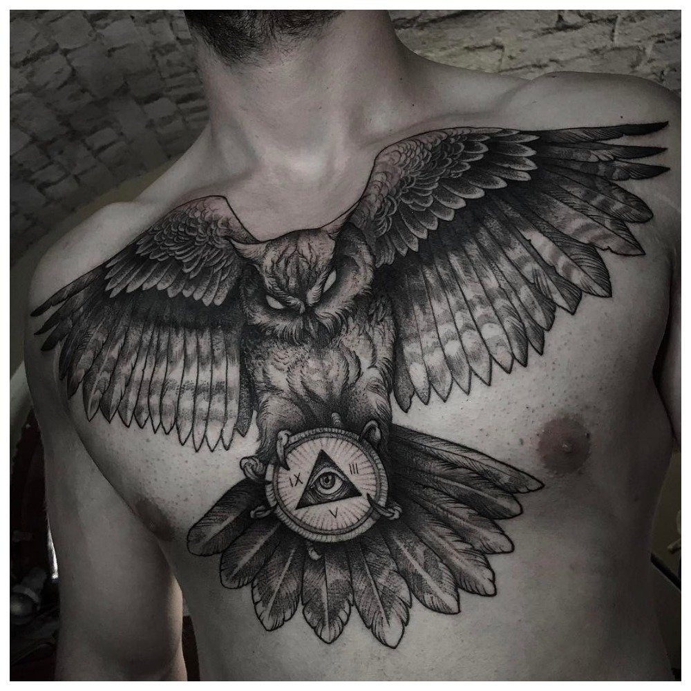 Bien entendu, les tatouages d’animaux sont le modèle le plus courant de tatouage de sternum masculin. Loup, lion, oiseaux - tout cela est le bienvenu et ne se démode pas.