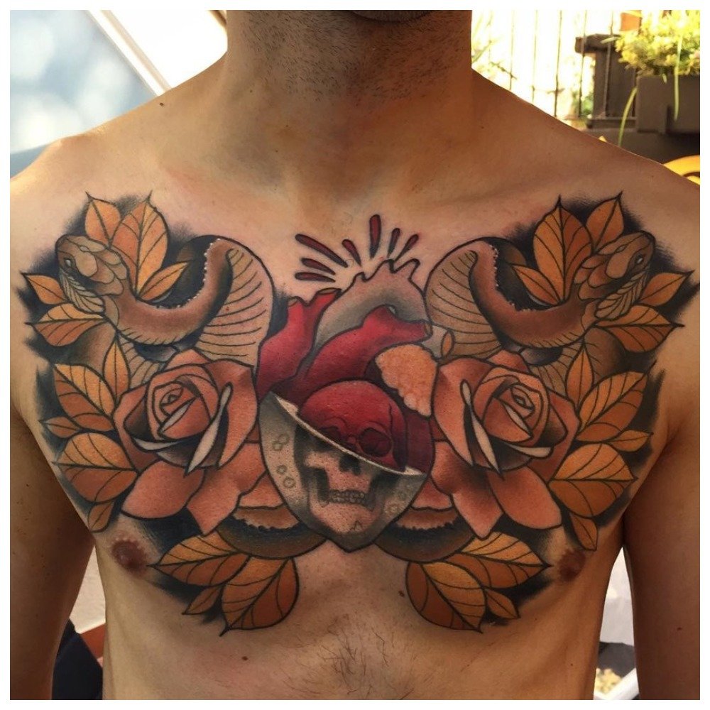 Dans les temps anciens, les tatouages sur la poitrine servaient de talisman à l'homme. Ils symbolisaient un bouclier et couvraient la partie la plus vulnérable du corps humain - le cœur. Aujourd'hui, le symbolisme du tatouage pour les hommes sur la poitrine a un peu changé. En gros, c’est une façon de se démarquer et de s’exprimer, ainsi que de mettre en valeur de beaux muscles en relief.