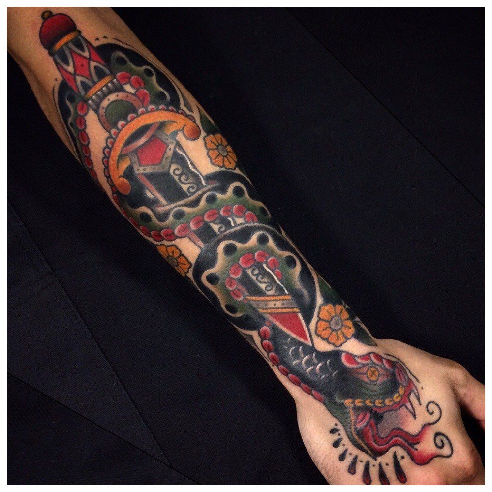 Le résultat est des tatouages très lumineux et mémorables. Cependant, ils doivent être faits avec précaution afin qu'au lieu d'une vieille école cool, un partak ordinaire ne fonctionne pas.