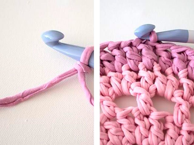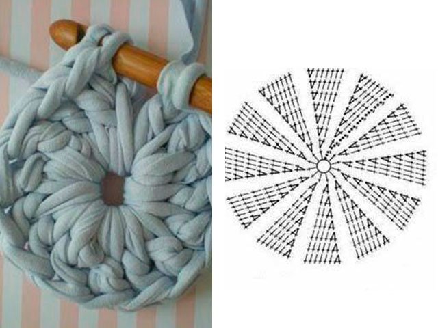 Pour commencer couper de vieux t-shirts en ficelles. Il est préférable de faire cela avec une spirale continue, de sorte que moins de nœuds doivent être noués. Après cela, vous devez prendre un crochet large et épais et commencer à gagner des boucles. Comme si vous les composiez en utilisant un fil normal. Fermer V.P. dans une chaîne et coudre l'articulation pour la force. Le modèle de tricot est attaché ci-dessous. En l’utilisant avec un fil simple, vous pouvez tricoter un tapis rond.