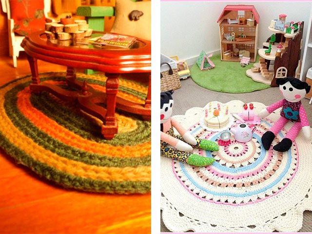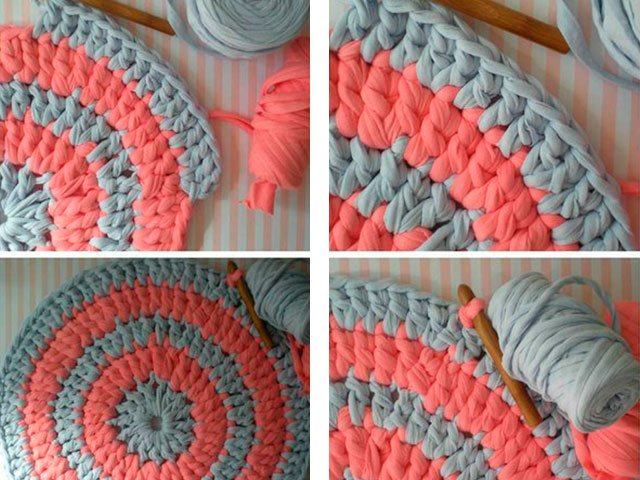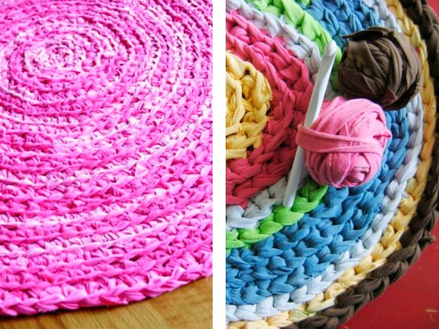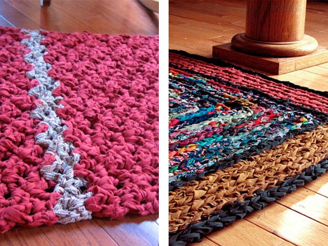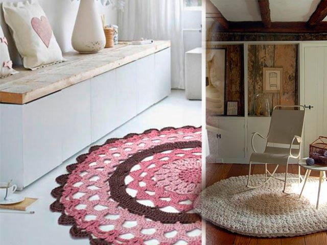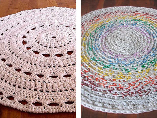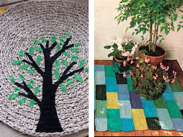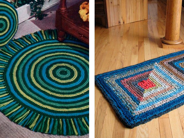 Comme nous l'avons écrit plus haut, le tapis peut être tricoté absolument de tout matériau, que ce soit un modèle de vieilles choses (T-shirts), à partir de sacs en plastique (de cellophane et de déchets) ou de fil ordinaire. Toute option sera belle dans votre maison sur le sol ou sur une chaise. Souvent, en plus des tapis, pour la décoration intérieure et les chambres créent de belles plaids de lambeaux de tissu, une couverture sur un tabouret, coussins multicolores de carrés tricotés avec aiguilles ou crochet, serviettes de table originales pour meubles ou sous vases de tasses en tricot pour plus de confort. Grande excitation autour des produits de fil tricoté - les modèles sont très «faits maison» et inhabituels.